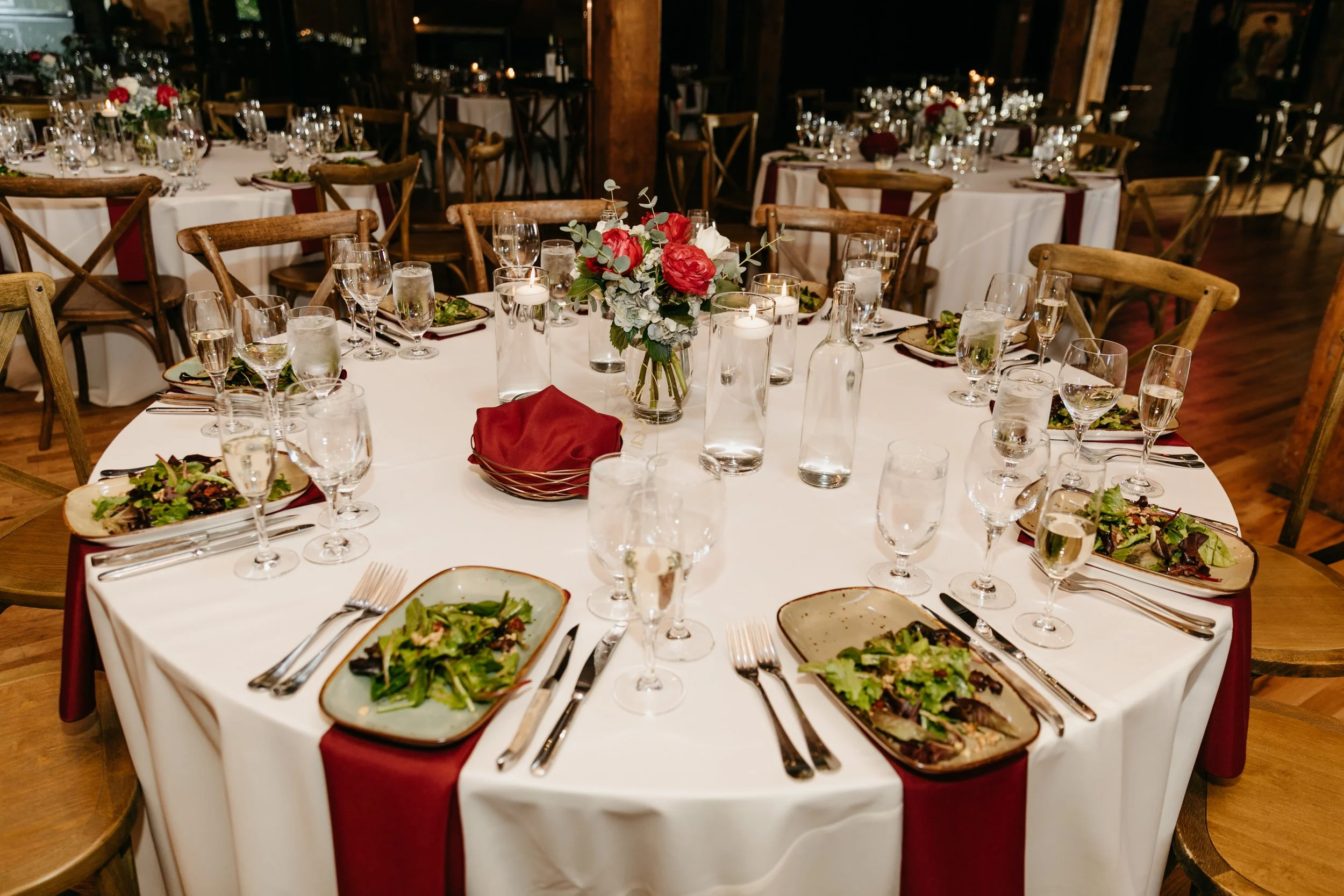 The venue includes 250 wooden cross-back chairs and 30 round dinner tables, which complement a range of aesthetic visions.