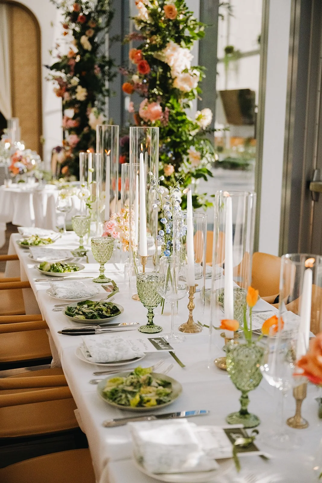 One of our favorite touches was the green glassware that added a perfect pop of color to the tablescapes. Paired with vibrant, romantic florals from Honey Flower Studio, the entire space felt alive and full of joy.