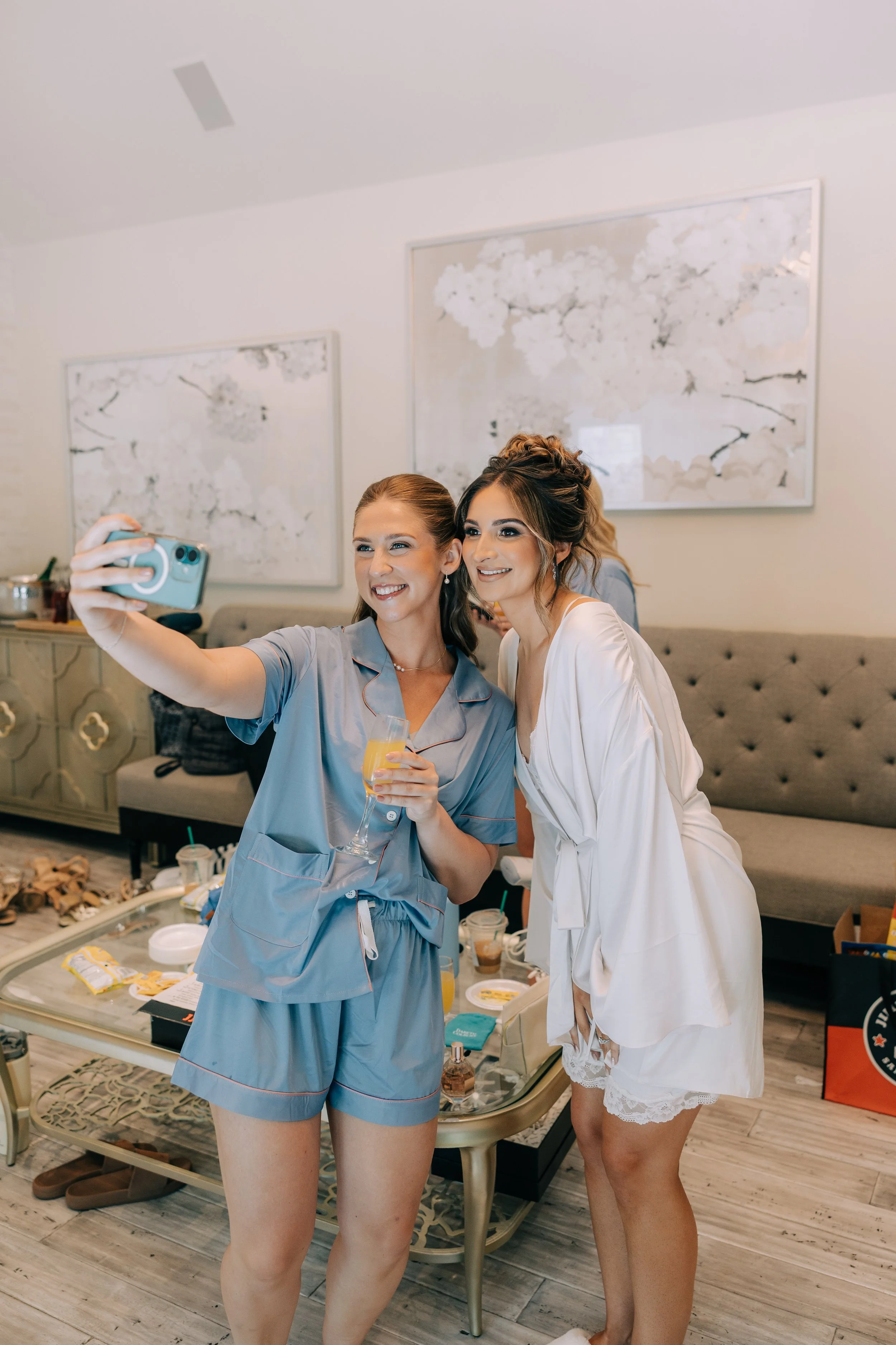 In the bridal suite, the bride and her bridesmaids sipped mimosas, clinked glasses, and laughed as the space filled with light.