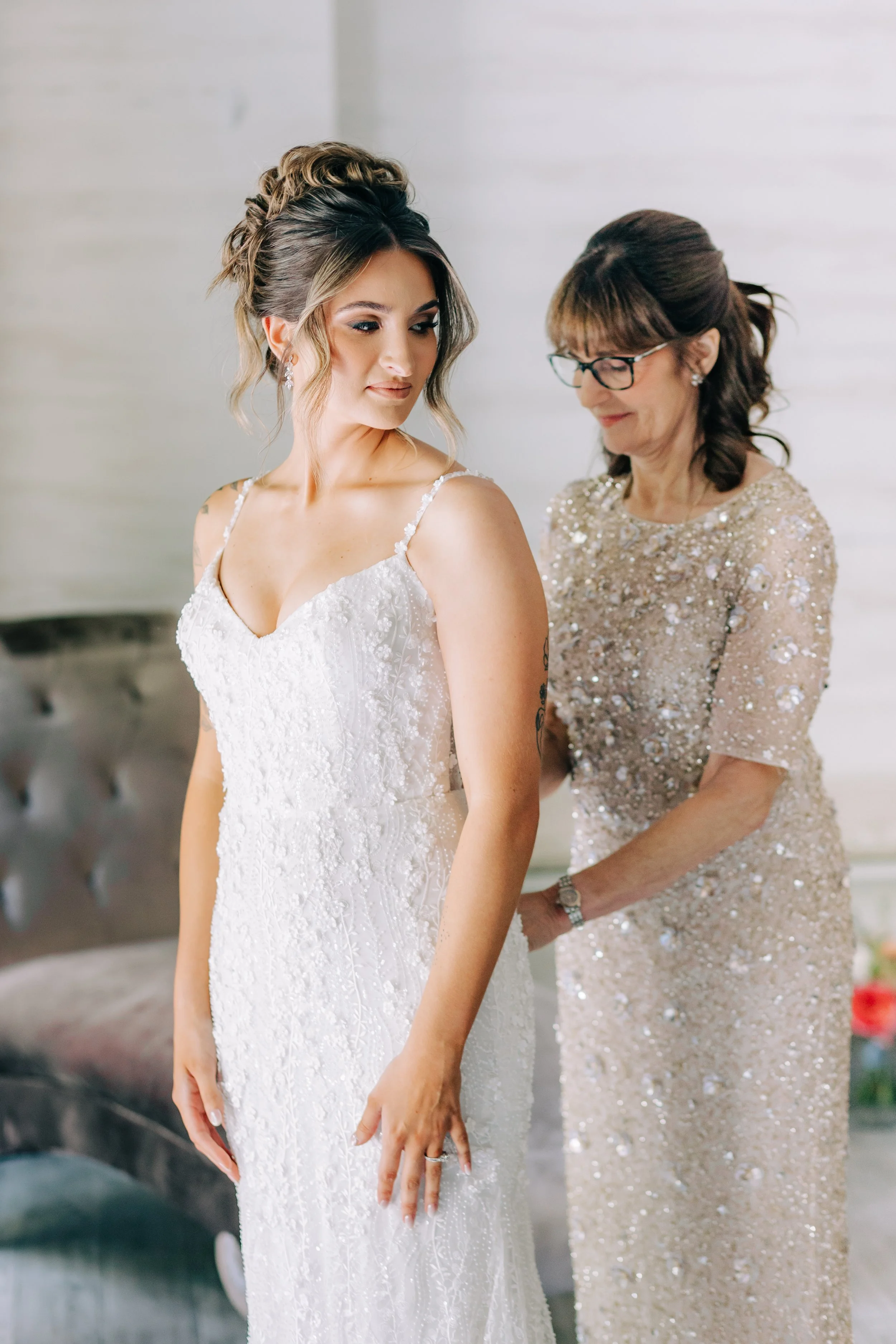 Paige's gown hung nearby, the details catching the light in quiet moments between hair and makeup.
