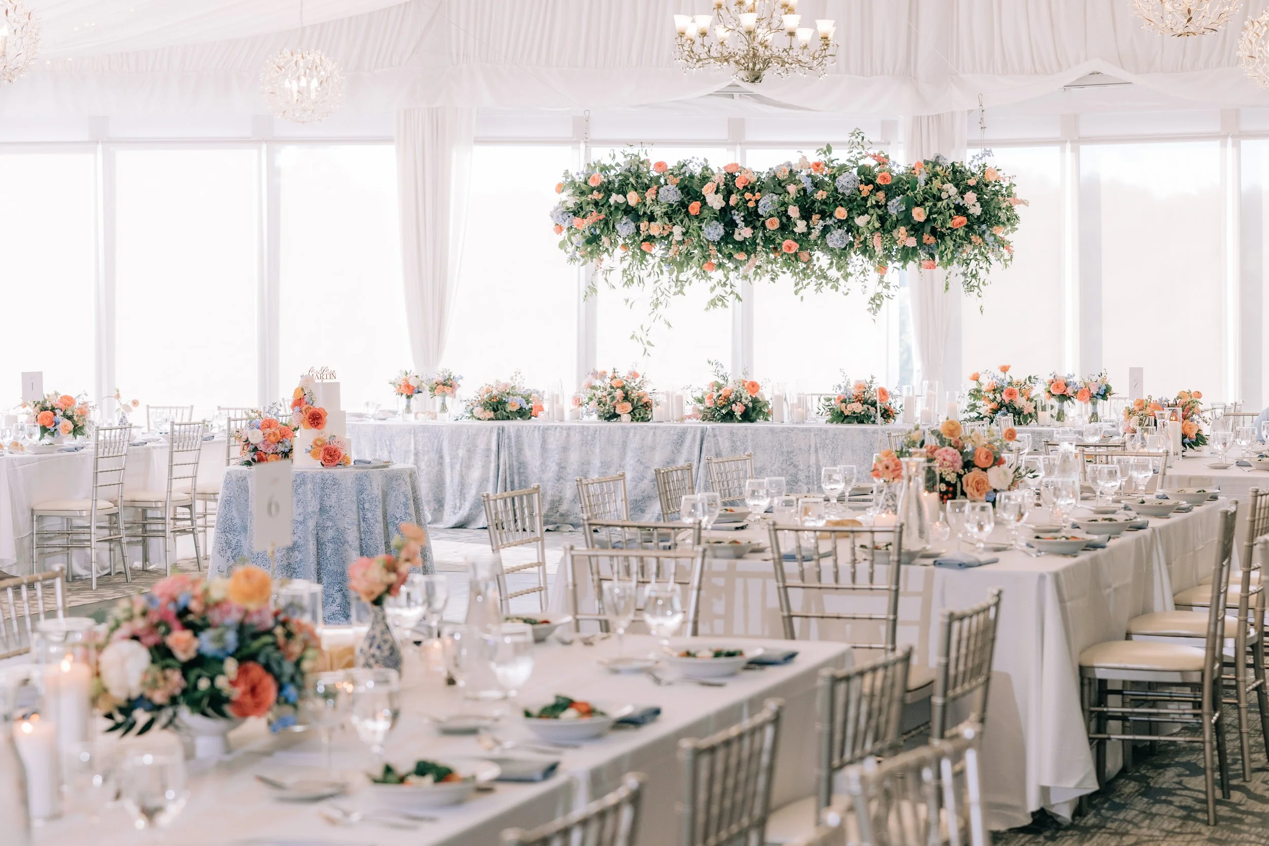 For the reception, the design leaned fully into abundance. Guests were greeted by a dramatic floral installation suspended above the head table, with blooms cascading overhead and arrangements layered throughout the space.