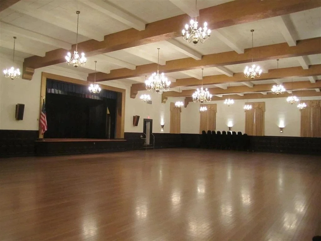 The venue also includes a mounted projector, which is handy for slideshows or video presentations, and a built-in stage in the ballroom, perfect for a live band or entertainment.