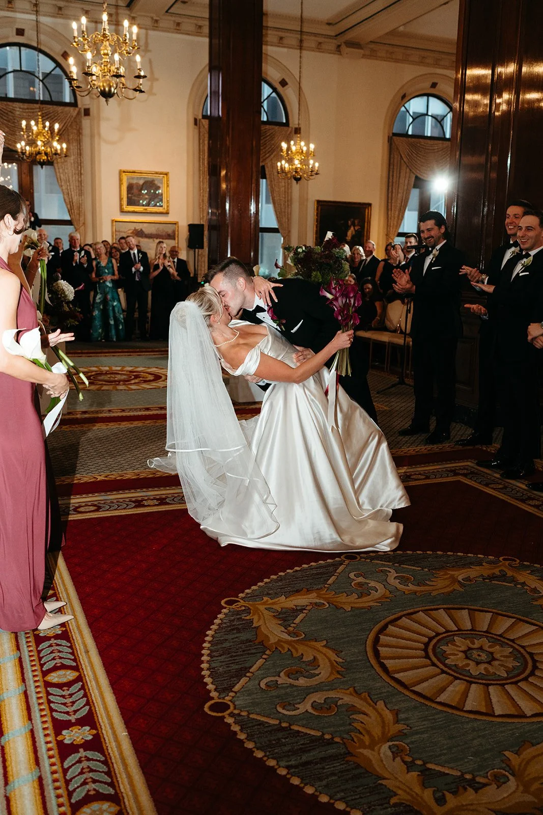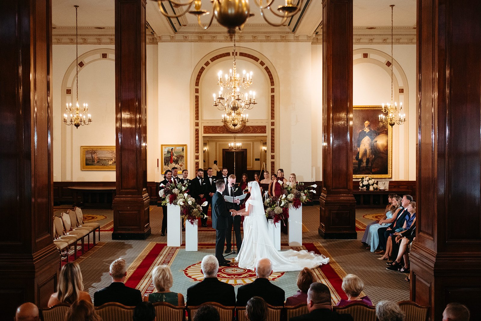 With several grand spaces available, our couple chose President’s Hall for both their ceremony and reception—a dramatic ballroom with soaring 28-foot ceilings that feels every bit as impressive as it sounds.